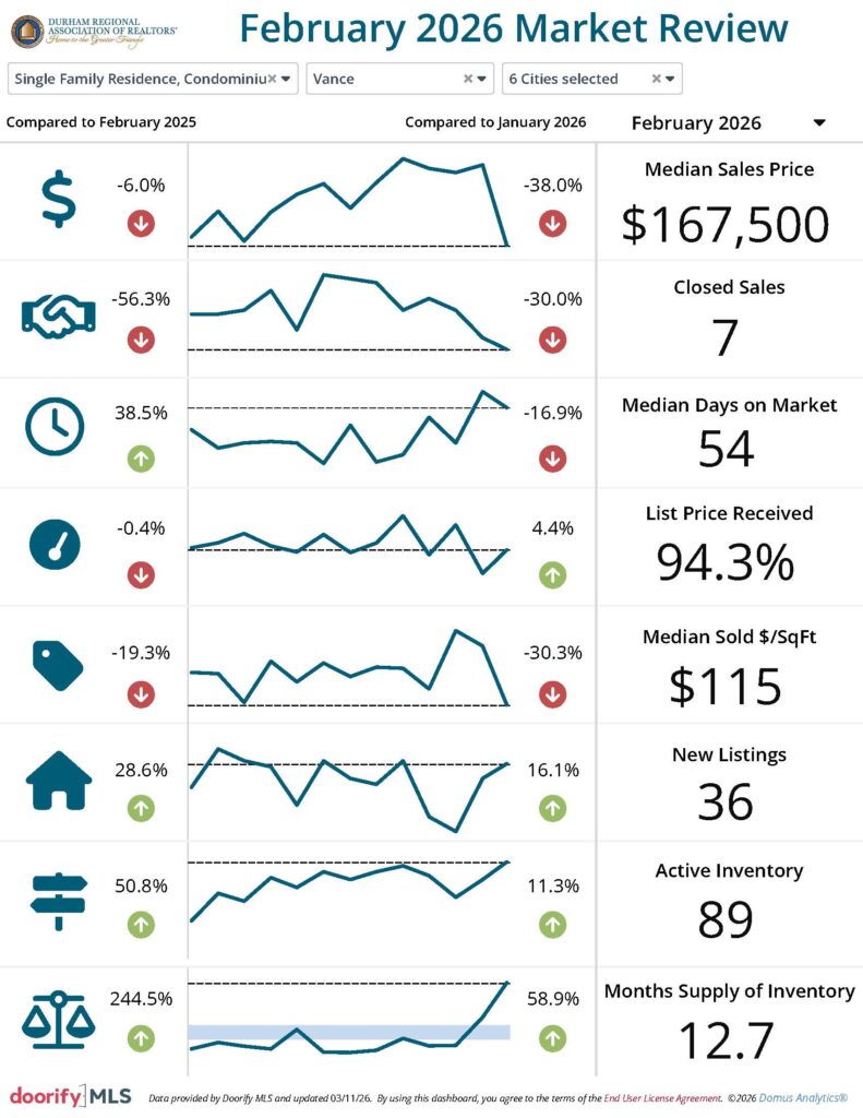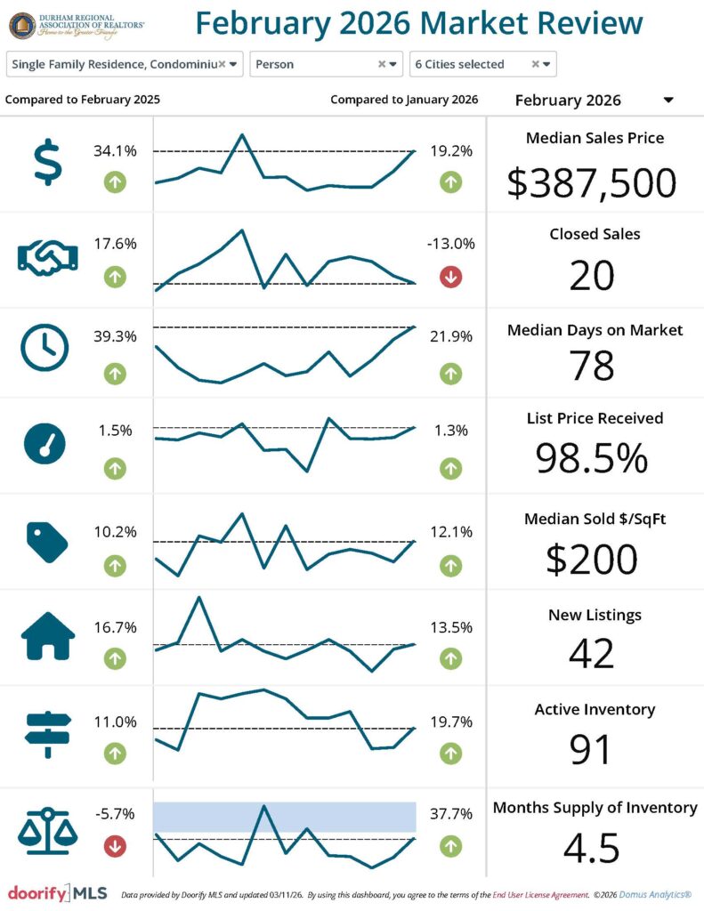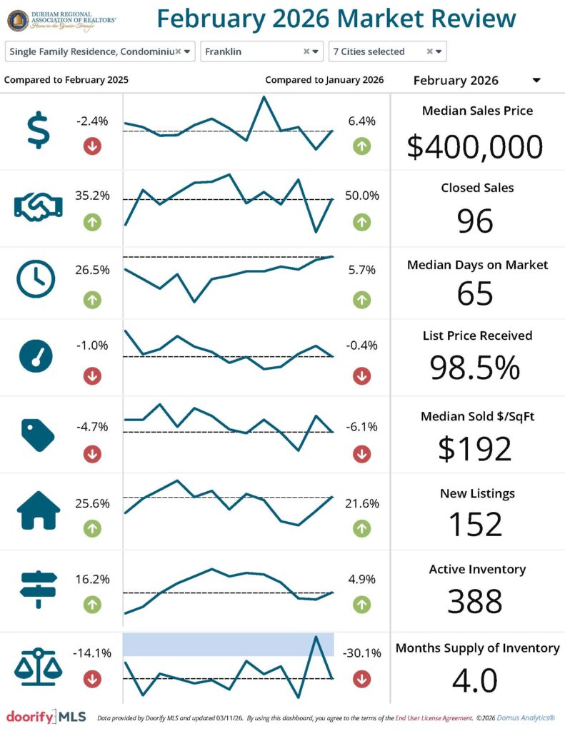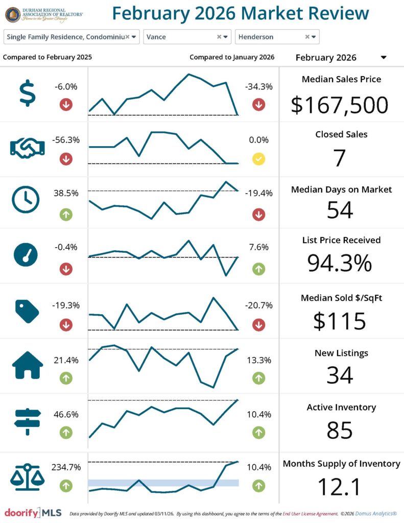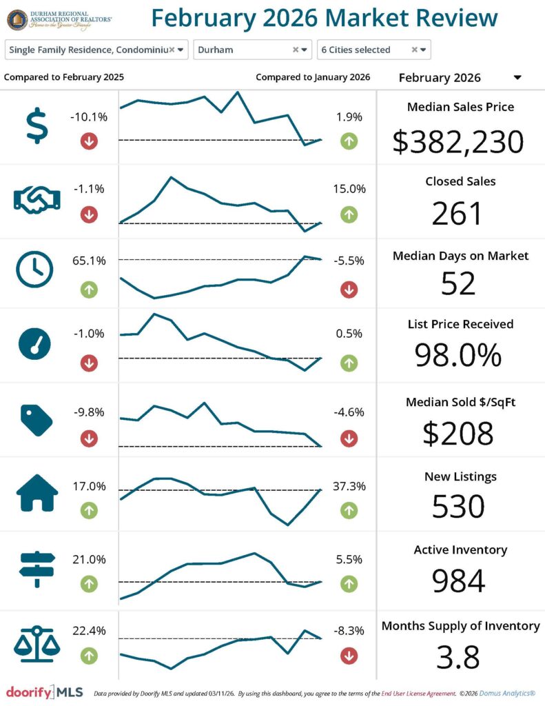 The Durham Regional Association of REALTORS® and the Doorify Multiple Listing Service (Previously TMLS) report the following information pertaining to the Durham housing market in February 2026. The data shown reflects information on properties located in Durham City, Henderson, the Triangle overall and Durham, Vance, Granville, and Person Counties.