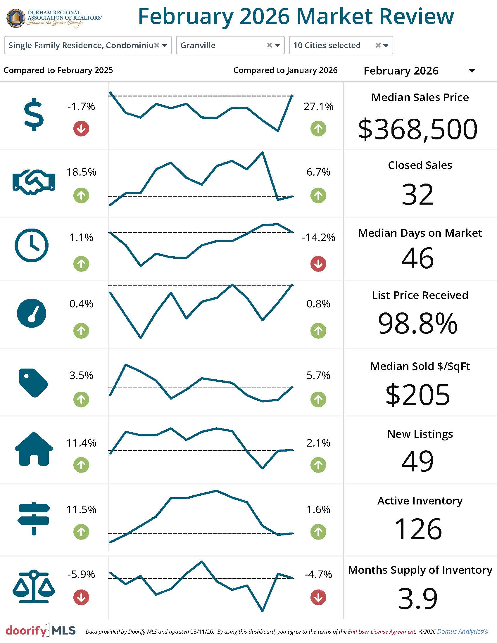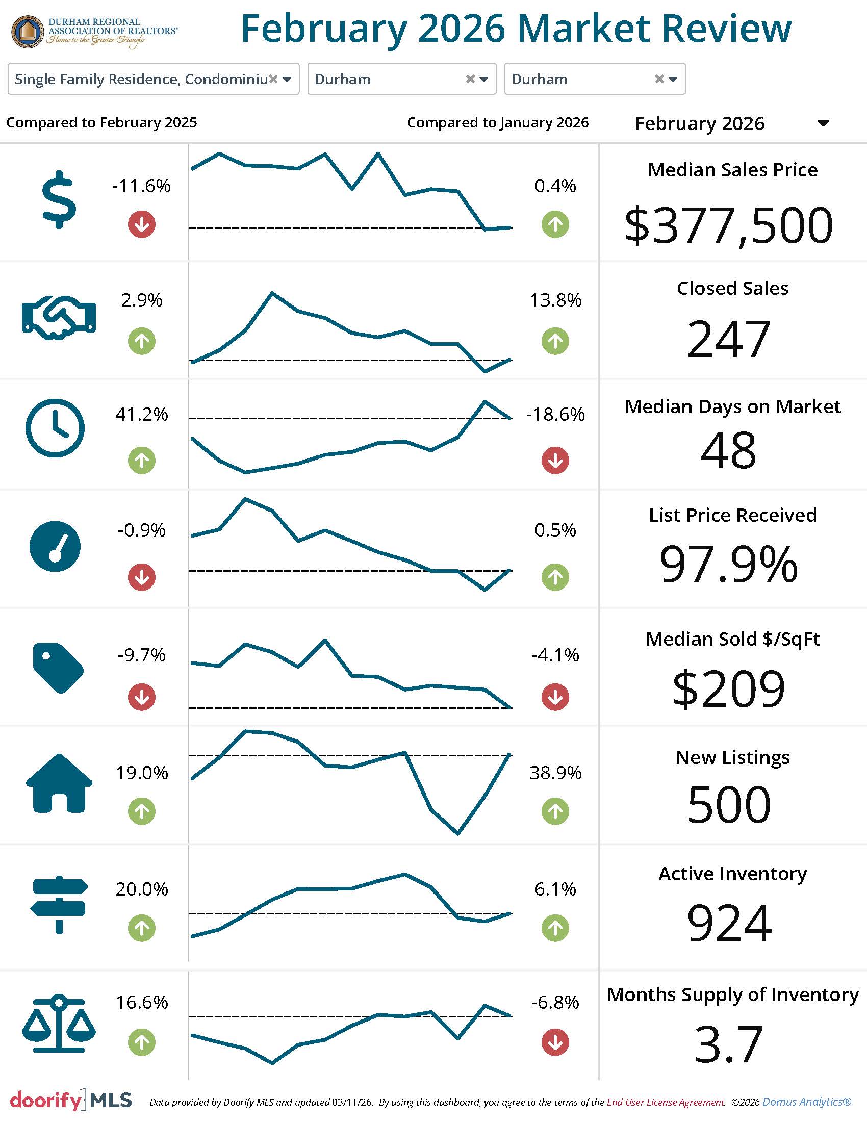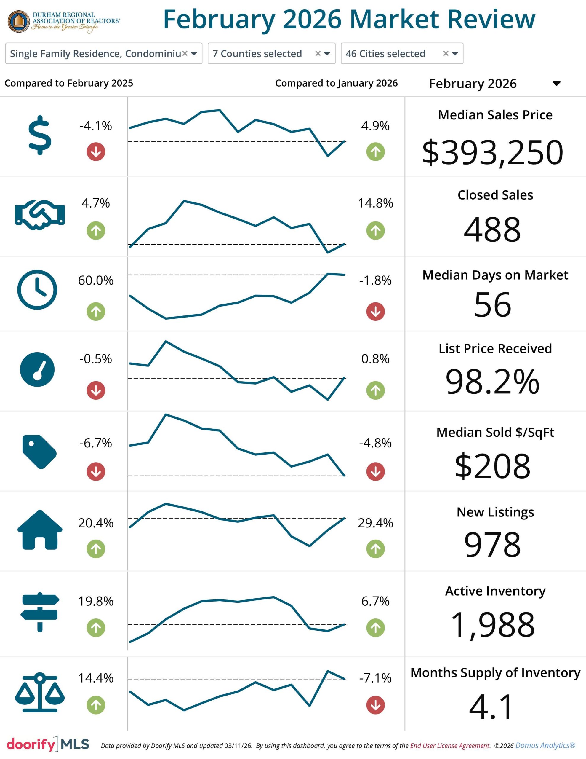 The Durham Regional Association of REALTORS® and the Doorify Multiple Listing Service (Previously TMLS) report the following information pertaining to the Durham housing market in February 2026. The data shown reflects information on properties located in Durham City, Henderson, the Triangle overall and Durham, Vance, Granville, and Person Counties.